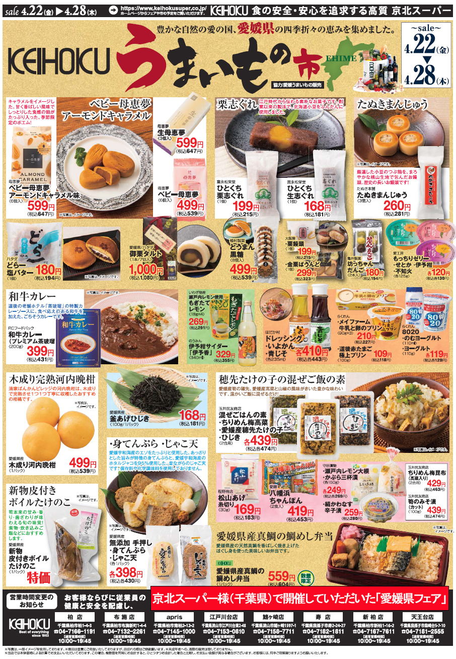 愛媛県フェアや四国、瀬戸内フェアのご提案が可能です。愛媛では時期に合わせた生産者限定の柑橘をはじめとして、郷土料理の鯛めしやじゃこてん、タルトを代表とする銘菓など、山の幸、海の幸を生かしたこだわりの商品を多数取り揃えております。ほかにもデリカや和洋日配、塩干を含めたトータル提案が可能です。