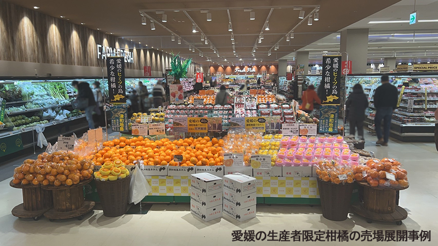 愛媛の生産者限定のこだわり柑橘から訳ありEDLP商品まで、ご要望に応じたご提案を行っております。10月の極早生みかんから始まり、愛媛を代表する高級柑橘の紅まどんなや甘平、せとか、姫小春などが続き、5月にはカラマンダリンや河内晩柑など、愛媛ならではの多種多彩な品種を、長い期間を通して様々な生産者や品種で売場作りをご提案し、地方市場ではなかなか手に入らない品揃えで差別化を図っています。