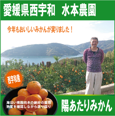 毎年ご好評をいただいております愛媛県西宇和で太陽と海の光をいっぱい浴びた水本さんのみかんの出荷が始まりました。今年も糖と酸のバランスの取れたコクのあるおいしいみかんが採れました。海沿い南西向きの長い時間太陽の光が注ぐ、気候も穏やかな園地で、水本さんが一年間丹精込めて育てたみかんです。 |